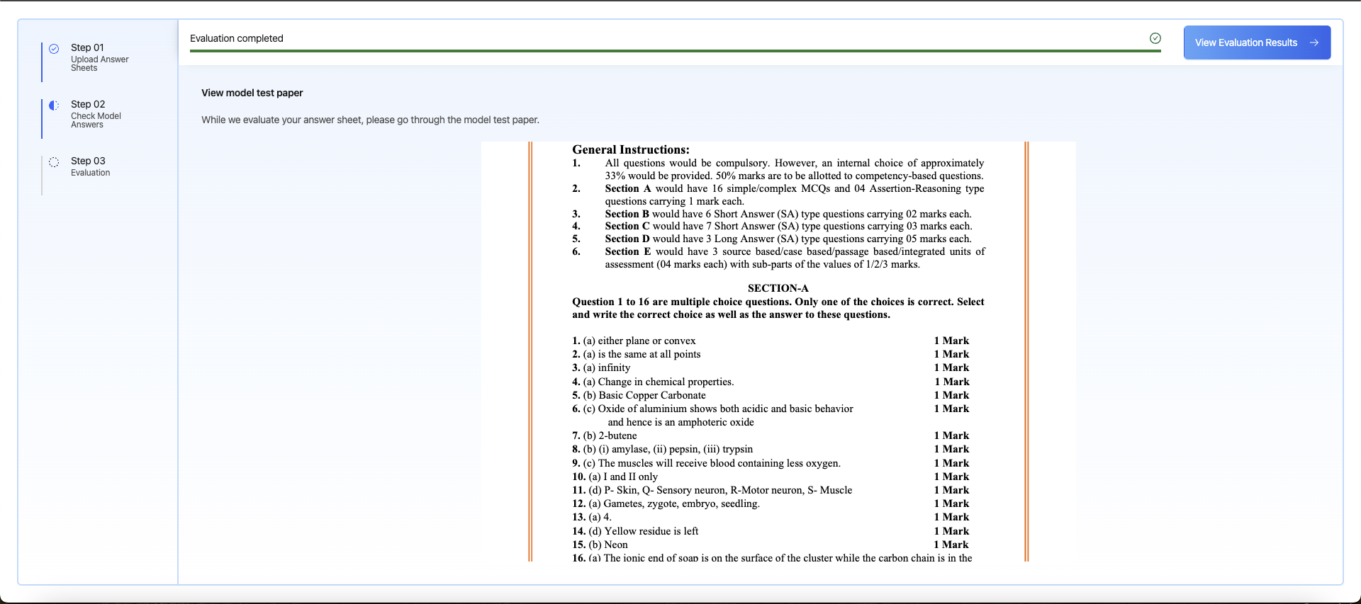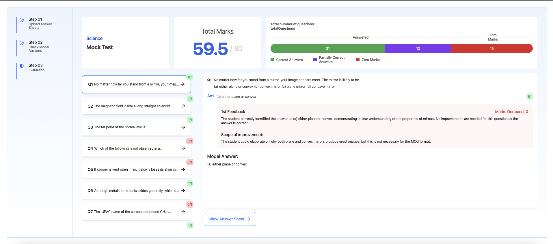 - Receive detailed evaluations with marks, feedback, and suggestions for improvement.